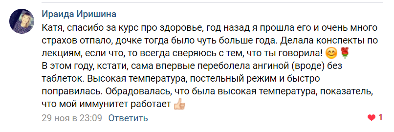 Катя, спасибо за курс про здоровье, год назад я прошла его и очень много страхов отпало, дочке тогда было чуть больше года. Делала конспекты по лекциям, если что, то всегда сверяюсь с тем, что ты говорила!