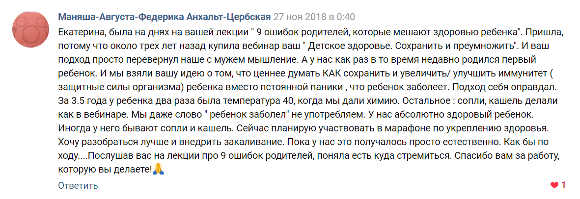 Екатерина, была на днях на вашей лекции " 9 ошибок родителей, которые мешают здоровью ребенка". Пришла, потому что около трех лет назад купила вебинар ваш " Детское здоровье. Сохранить и преумножить". И ваш подход просто перевернул наше с мужем мышление. А у нас как раз в то время недавно родился первый ребенок. И мы взяли вашу идею о том, что ценнее думать КАК сохранить и увеличить/ улучшить иммунитет ( защитные силы организма) ребенка вместо пстоянной паники , что ребенок заболеет. Подход себя оправдал. За 3.5 года у ребенка два раза была температура 40, когда мы дали химию. Остальное : сопли, кашель делали как в вебинаре. Мы даже слово " ребенок заболел" не употребляем. У нас абсолютно здоровый ребенок. Иногда у него бывают сопли и кашель. Сейчас планирую участвовать в марафоне по укреплению здоровья. Хочу разобраться лучше и внедрить закаливание. Пока у нас это получалось просто естественно. Как бы по ходу....Послушав вас на лекции про 9 ошибок родителей, поняла есть куда стремиться. Спасибо вам за работу, которую вы делаете!